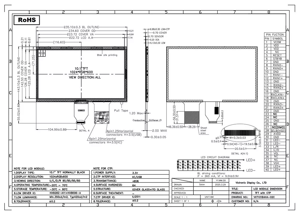В эпоху интеллекта модуль TFT позволяет нам представлять необходимые данные визуально. Качество модуля TFT оказывает решающее влияние на его применение. Каковы преимущества модуля TFT Victronix 10,1 дюйма 1024 × 600 LVD с CTP? Сначала его яркость 420 кД/м², соотношение контрастности 800: 1, угол просмотра 80 градусов во всех направлениях и 75% однородность обеспечивают яркие образы. Во-вторых, он поддерживает 6/8-битный интерфейс LVDS с контроллером HX8282A11+HX8696A и устойчивой 5-точечной емкостной сенсорной панелью с контроллером CTP ILI2511. Кроме того, он оснащен белой подсветкой под светом 3 × 13 с сроком службы от 30 000 до 50 000 часов, что обеспечивает его долгосрочное удобство использования в различных промышленных приложениях. Кроме того, он соответствует стандартам ROHS и успешно проходит строгие испытания на надежность, включая тепловой удар, влажность и защиту ESD до 8 кВ воздуха и контакт с 4 кВ. Этот продукт работает эффективно при экстремальных температурах в диапазоне от -20 ° C до +70 ° C и может выдерживать тяжелые условия хранения от -30 ° C до +80 ° C.