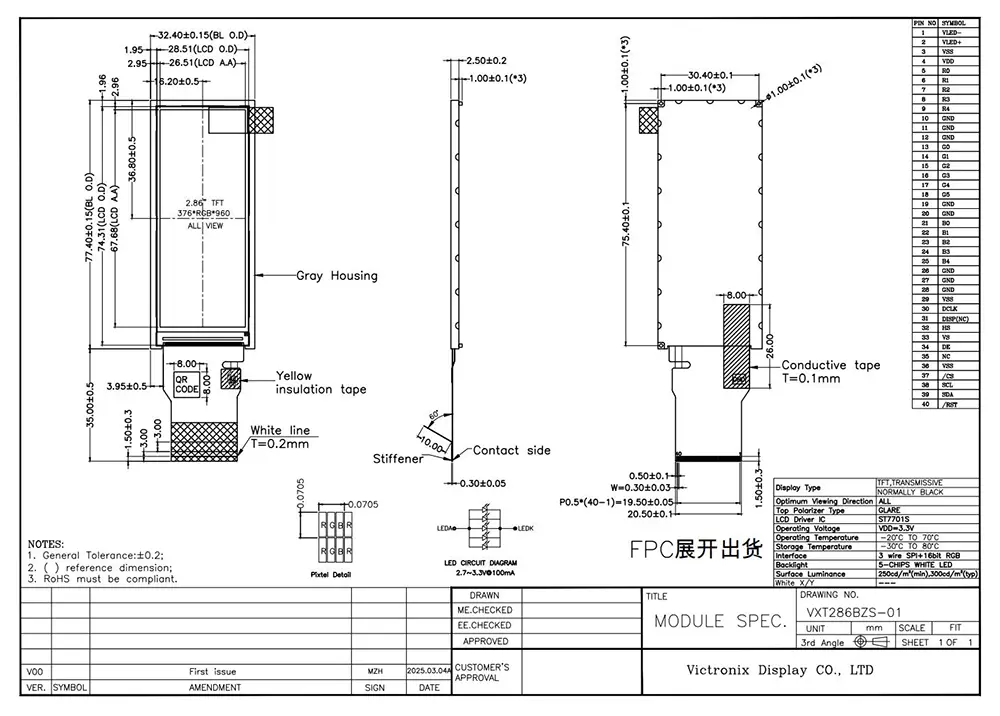 В эпоху интеллекта модуль TFT позволяет нам представлять необходимые данные визуально. Качество модуля TFT оказывает решающее влияние на его применение. Каковы преимущества модуля TFT Victronix 2,86 дюйма 376 × 960 IPS? Сначала его яркость 300 кд/м², соотношение контрастности 1500: 1, угол просмотра на 85 градусов во всех направлениях и 80% однородность обеспечивают яркие образы. Во-вторых, он поддерживает интерфейс SPI+16-битный RGB с ST7701S и 5-го белого светодиодного подсветки с от 30 000 до 50 000 часов, обеспечивая его долгосрочную удобство использования в различных промышленных приложениях. Кроме того, он соответствует стандартам ROHS и успешно проходит строгие тесты на надежность, включая тепловой удар, влажность и защиту ESD до 8 кВ и контакт с 4 кВ. Этот продукт работает эффективно при экстремальных температурах в диапазоне от -20 ° C до +70 ° C и может выдерживать тяжелые условия хранения от -30 ° C до +80 ° C.