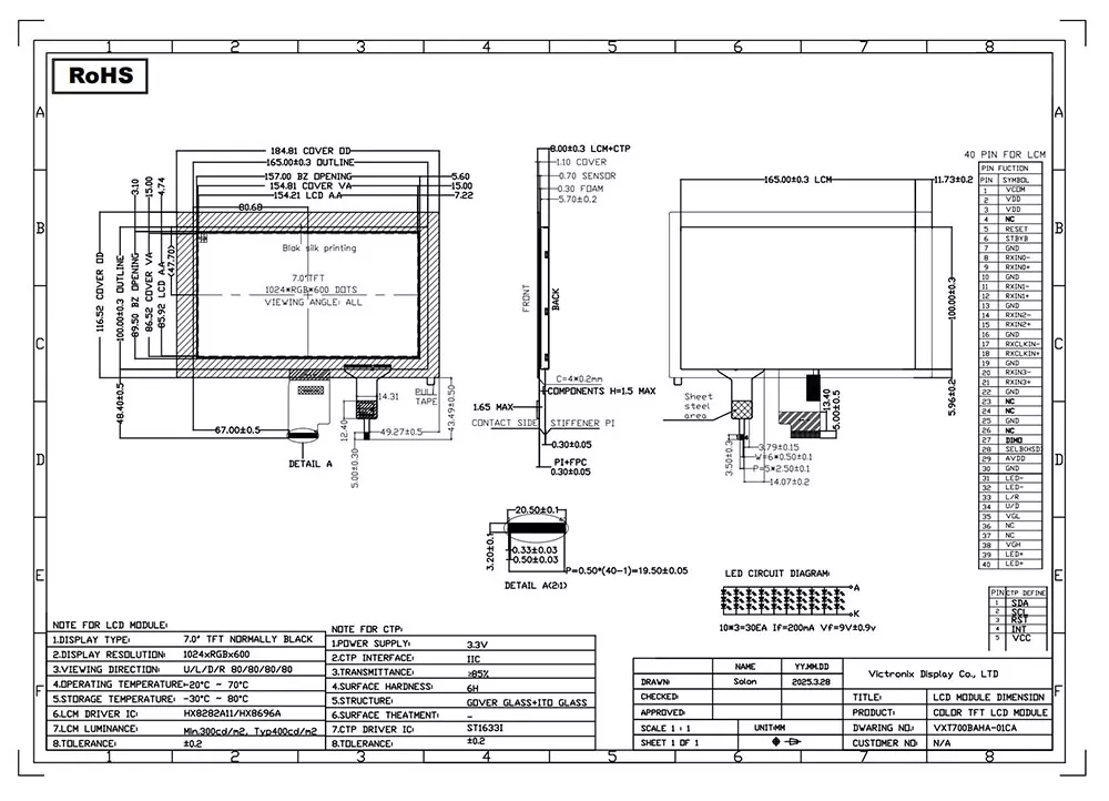 В эпоху интеллекта модуль TFT позволяет нам представлять необходимые данные визуально. Качество модуля TFT оказывает решающее влияние на его применение. Каковы преимущества Victronix 7 -дюймового 1024 × 600 LVD IPS IPS TFT LCD? Сначала его яркость 420 кД/м², соотношение контрастности 800: 1, угол просмотра 80 градусов во всех направлениях и 75% однородность обеспечивают яркие образы. Во-вторых, он поддерживает интерфейс LVDS с контроллером HX8282A11/HX8696A, емкостной сенсорной панелью ST1633I и белой светодиодной подсветкой 3 × 10 с от 30 000 до 50 000 часов, обеспечивая его долгосрочную удобство использования в различных промышленных приложениях. Кроме того, он соответствует стандартам ROHS и успешно проходит строгие тесты на надежность, включая тепловой удар, влажность и защиту ESD до 8 кВ и контакт с 4 кВ. Этот продукт работает эффективно при экстремальных температурах в диапазоне от -20 ° C до +70 ° C.